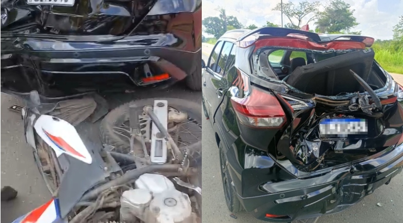 O impacto foi tão forte que a traseira do carro amassou e o vidro ficou em estilhaços. O PM caiu dentro do carro, bem ao lado do bebê conforto. O retrovisor da motocicleta também foi arremessado para o interior do veículo.