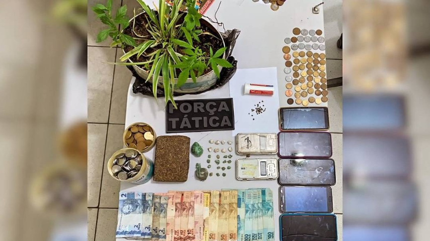 Com ele foram apreendidos crack, maconha, sementes e um pé da erva, além de dinheiro, balanças de precisão, aparelhos celulares, caderno com anotações sobre a contabilidade do tráfico e uma motocicleta, que era usada para fazer a entrega da droga.