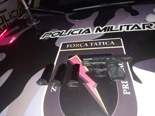 Por volta das 00h20 de hoje, o carro em que estava o suspeito, foi submetido a uma abordagem. E nisso, os policiais constataram que o homem estava com uma pistola “Taurus”, da cor preta, 9mm, na cintura.