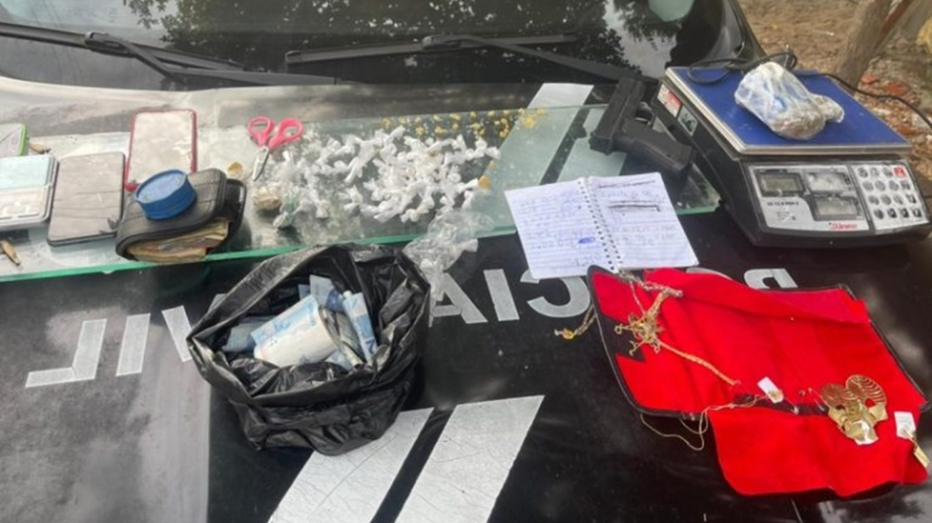 "A equipe saiu para dar cumprimento a um mandado de prisão, mas o suspeito não foi encontrado. No local, prendemos três pessoas e apreendemos drogas, dinheiro, balança, aparelhos celulares, e uma arma de fogo. Seguimos as diligências para prender o outro suspeito.'', completou o delegado Emir Maia.