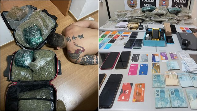 Durante o cumprimento de mandado de prisão foram aprendidos cartões de crédito, celulares, dinheiro e na residência de um dos envolvidos, a polícia civil apreendeu duas malas com grande quantidade de skank também conhecida como “supermaconha”.