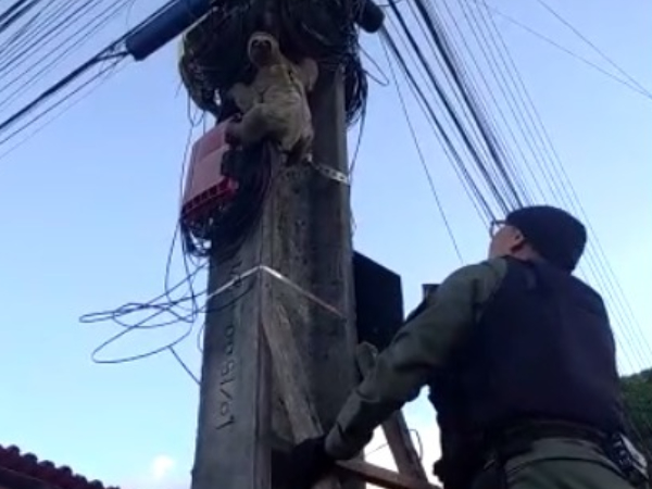 O Coordenador de Policiamento da Unidade (CPU) do dia do 9° BPM, sargento Oliveira, juntamente com o sargento Josimar, foram acionados por populares acerca do animal, que estava na fiação com risco de chegar aos cabos de alta tensão e ser eletrocutado.