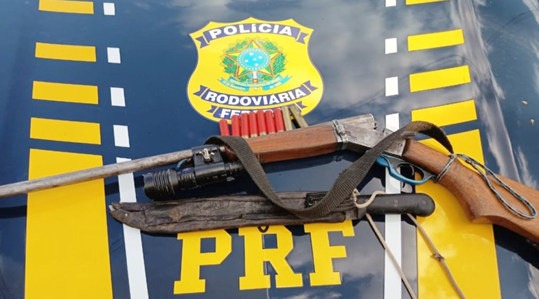 Uma espingarda calibre 28, munições e uma arma branca foram apreendidas pela Polícia Rodoviária Federal (PRF) durante fiscalização na BR-316, em Barro Duro.