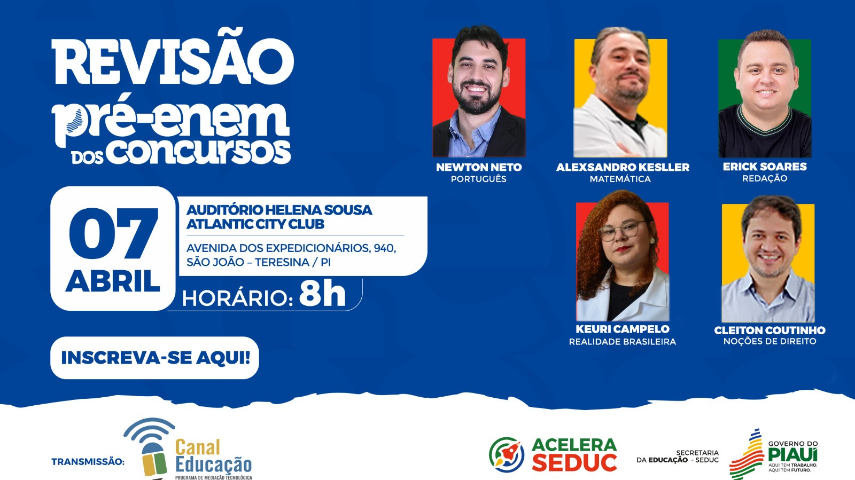 No domingo (7), será realizada em Teresina uma revisão preparatória gratuita para o Concurso Público Nacional Unificado (CPNU) no Atlantic City Club, com transmissão ao vivo pelo Canal Educação. O evento vai tratar os principais temas de Língua Portuguesa, Noções de Direito, Matemática, Realidade Brasileira e Redação.