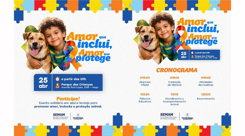 A Secretaria Municipal de Meio Ambiente e Recursos Hídricos (Semam) vai realizar uma ação especial em alusão ao Abril Azul, mês da conscientização sobre o autismo, e ao Abril Laranja, dedicado à prevenção da crueldade contra os animais. O evento vai acontecer no dia 25 de abril, a partir das 9h no Parque das Crianças, em Teresina.