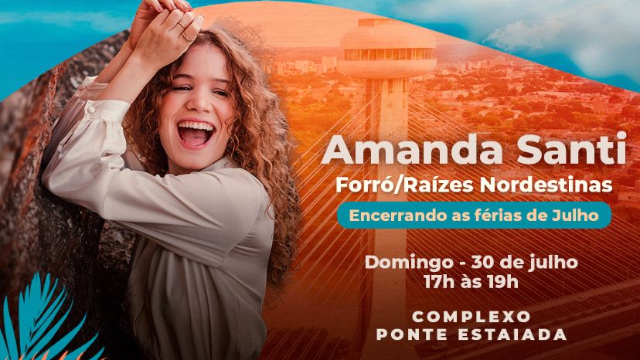 Dando continuidade à programação musical do projeto ''Pôr do Sol Teresina'', a Secretaria de Desenvolvimento Econômico e Turismo (SEMDEC) levará a cantora Amanda Santi para o palco do calçadão da Ponte Estaiada neste domingo (30).