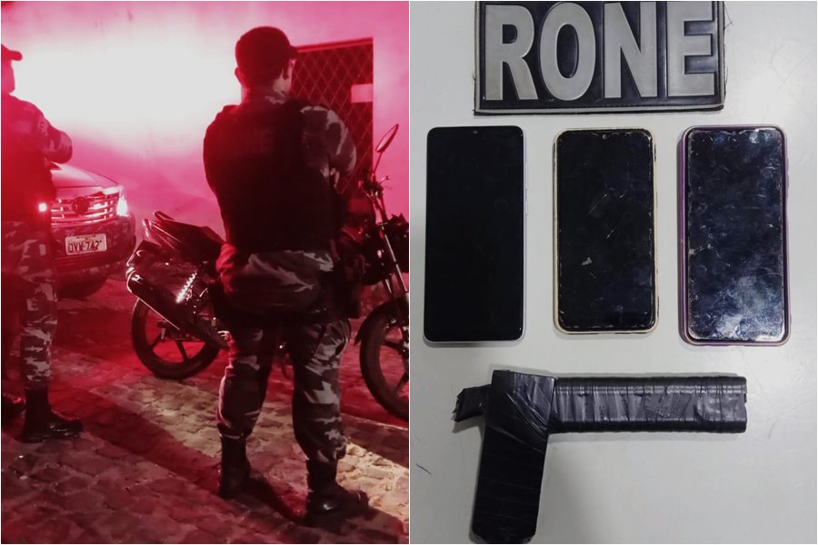 Durante o acompanhamento tático, os suspeitos caíram da moto, um deles fugiu a pé, já o outro, acabou sendo apreendido pelos policiais. Com o menor foi encontrado dois celulares e um simulacro de arma de fogo.