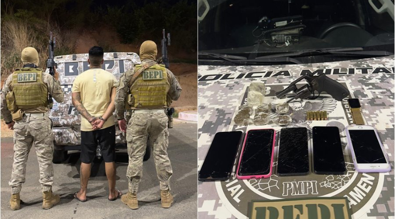 Com o suspeito, a polícia encontrou um revólver calibre .38 municiado, porções de maconha e cinco celulares, sendo que dois tinham registro de roubo ou furto.