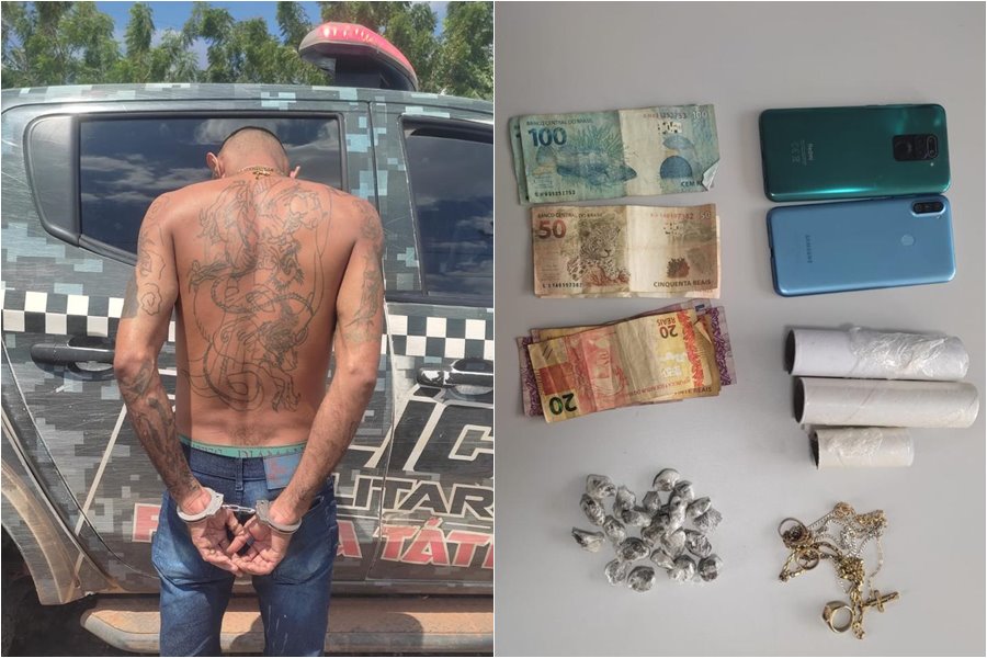 O suspeito identificado como M.J.F. de M.L. foi detido no local e teria assumido a posse dos materiais apreendidos, que incluem: 22 invólucros de substância análoga à maconha; três rolos de filme plástico utilizados para embalagem de entorpecentes; dois celulares com restrição de roubo/furto, sendo um Samsung azul e um Redmi azul metálico; R$ 467,00 em cédulas diversas; três anéis dourados; dois colares dourados e um colar de prata.