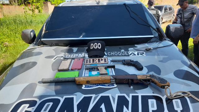 As armas são duas pistolas do assalto, uma escopeta calibre 12 e uma quarta, de fabricação caseira. Uma televisão que seria do assalto a residência do policial foi recuperada na incursão. Os indivíduos e todo o material foi encaminhado para a Central de Flagrantes para os procedimentos cabíveis.