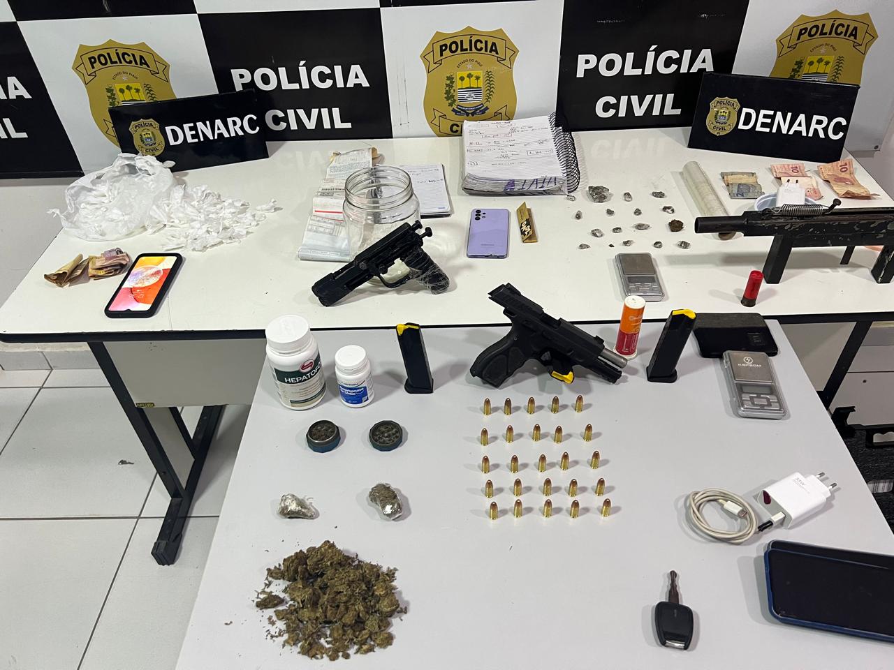 Conforme as autoridades, três armas de fogo, drogas, dinheiro e munições foram apreendidas. Todo o material e os presos foram encaminhados para a central de flagrantes.