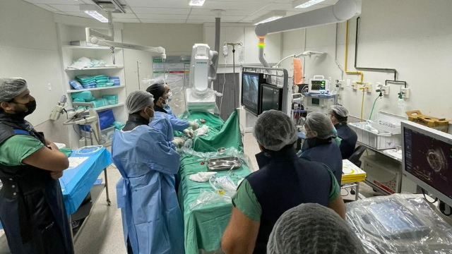 O procedimento foi feito em um paciente de 87 anos com histórico de cirurgia de revascularização e duas pontes. “Após 37 anos de cirurgia a ponte ainda tá aberta. Recentemente ele teve um infarto e foi submetido a um cateterismo onde encontramos uma obstrução em 90% da artéria, uma lesão extremamente calcificada. Tentamos a angioplastia, mas os balões não conseguiam quebrar essa placa calcificada e abrir o ponto de obstrução. Por isso, fizemos a solicitação do dispositivo Shockwave, que é um cateter balão que libera ondas ultrassônicas de pressão responsáveis por quebrar o cálcio”, detalha o médico.