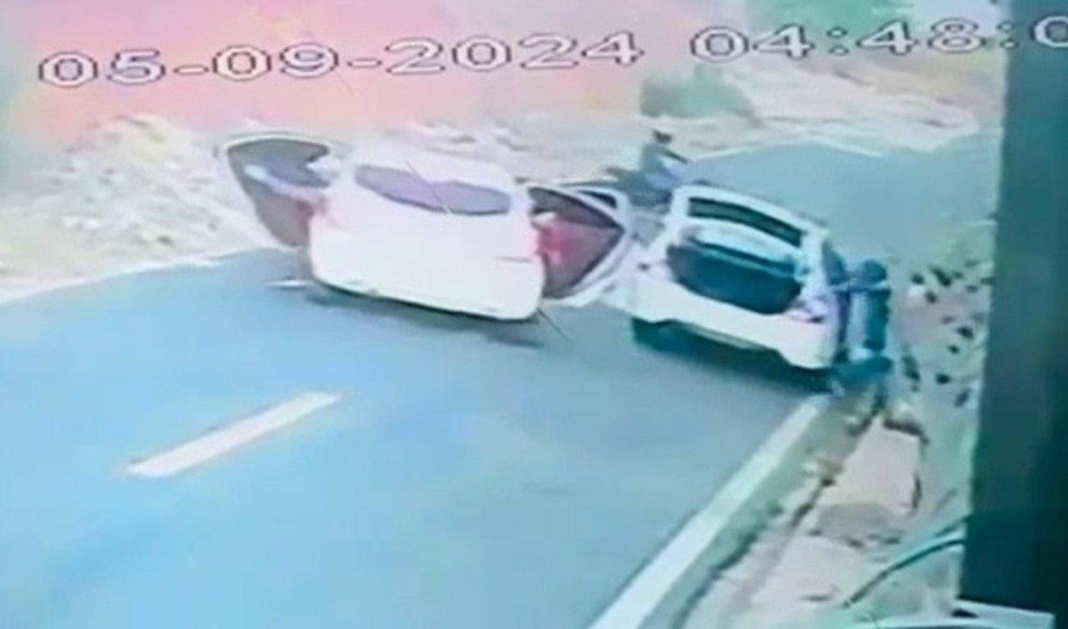 Nesse momento, um carro e uma motocicleta se aproximam, e pelo menos sete homens surpreendem a família. O pai, que estava dirigindo, é arrastado para fora do carro pelos criminosos e forçado a deitar no chão.