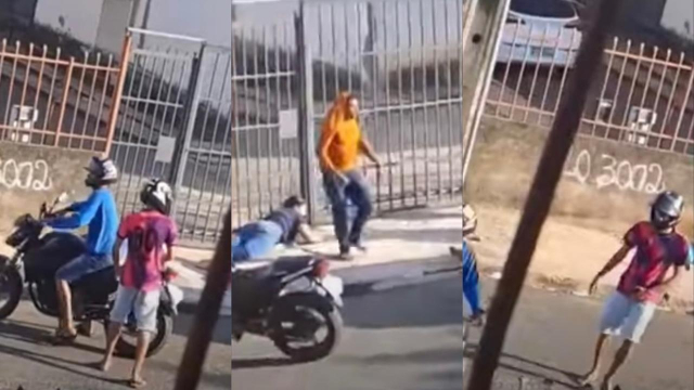 Um outro vídeo, dessa vez gravado por uma câmera de segurança, mostra os quatro bandidos, divididos em três motos. Eles abordam duas pessoas em uma motocicleta, ameaçando-as com uma arma e obrigando as vítimas a descerem do veículo. A câmera mostra que a ação aconteceu às 6h55 de hoje (13).