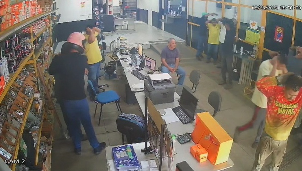 O crime, que foi registrado por câmeras de segurança do estabelecimento, mostra o momento, por volta das 10h deste sábado, em que dois assaltantes encaminham ao menos onze pessoas para a entrada da loja, um deles portando uma arma de fogo, enquanto outro, usando um capacete, se direciona à outras vítimas.