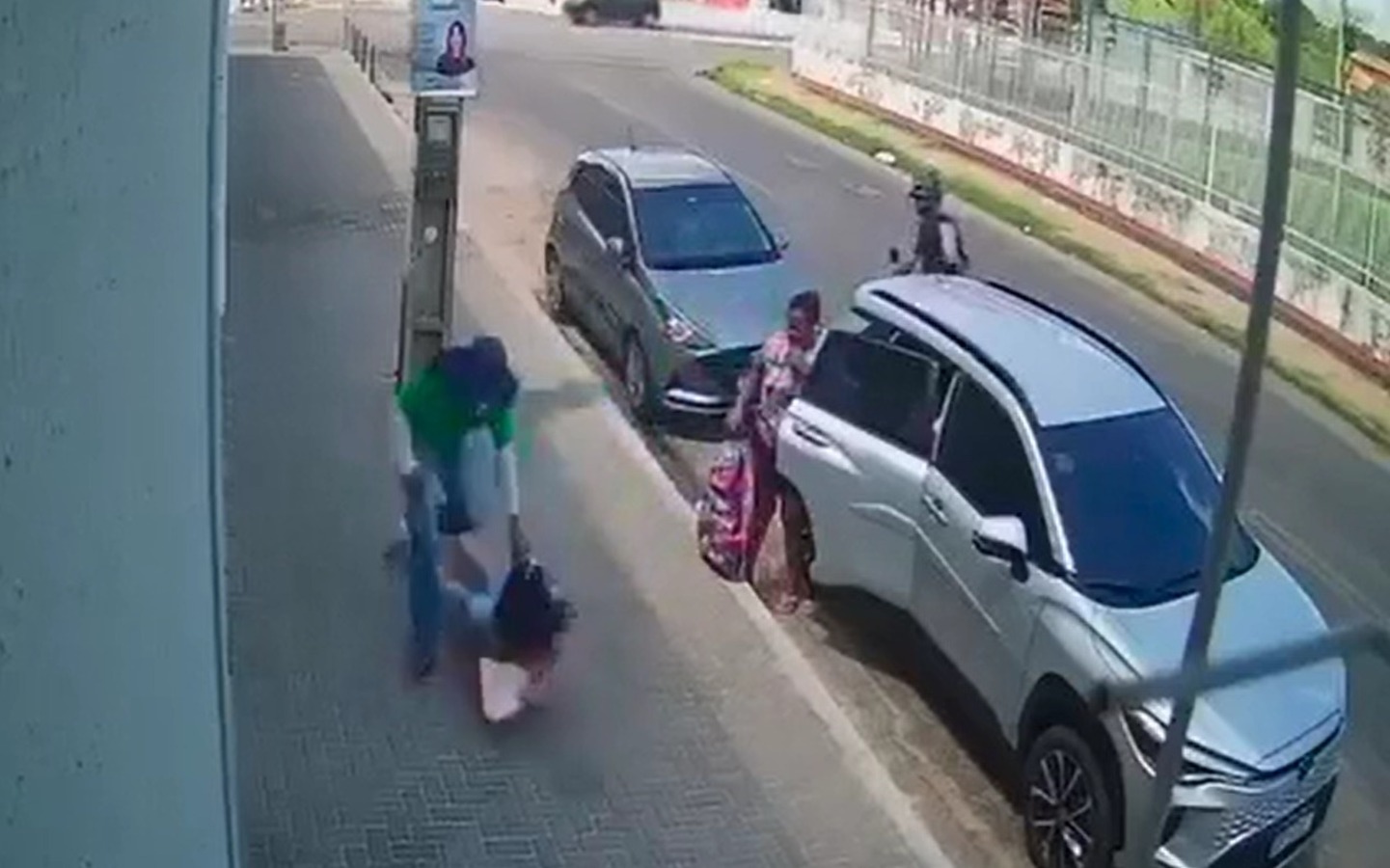 As imagens mostram dois criminosos chegando ao local em uma motocicleta. No momento do ataque, duas mulheres e uma criança estavam embarcando em um carro de passeio. Um dos assaltantes desce da moto, se aproxima rapidamente e aborda uma das mulheres, que acaba caindo na calçada enquanto ele tenta roubar seus pertences.
