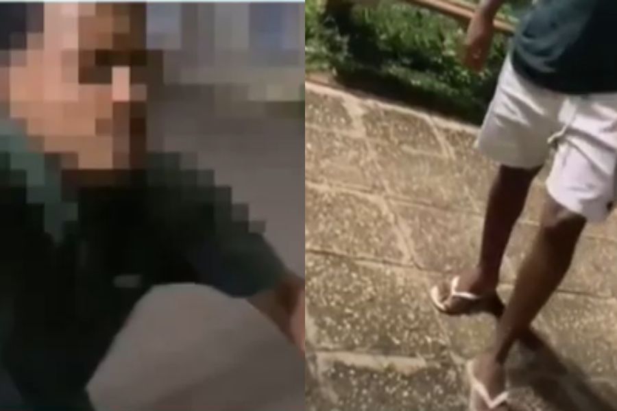 Na ocasião, um homem está sentado em um banco de uma praça. “Magão”, que está em uma motocicleta pilotada por um amigo, pede para o mesmo dar a volta e chegar perto da vítima da pegadinha. “Chega só nas 'manhas' para ele fica no pânico, ele vai ficar no medo”, afirma o jovem.