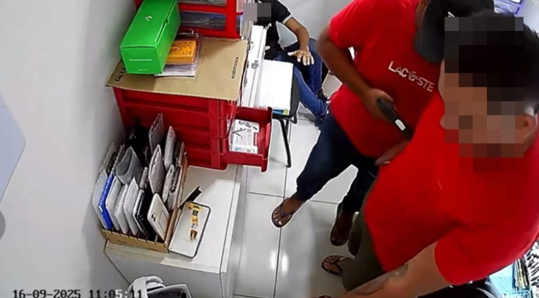 Câmeras de segurança do local registraram o momento da ação criminosa. Nas imagens, um dos assaltantes aparece apontando a arma para a cabeça de uma das vítimas e chega a ordenar que o jovem desligue a câmera, enquanto o comparsa recolhe objetos.