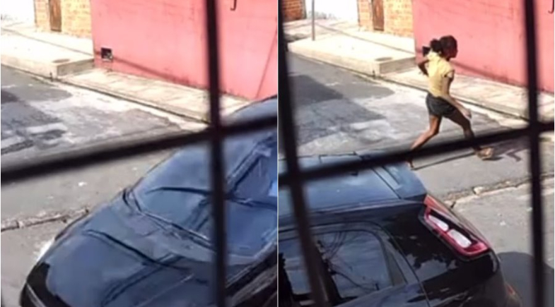 No vídeo, é possível observar que a vítima conversa com outra mulher na rua, quando um carro preto, modelo Fiat/Punto se aproxima.