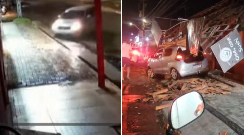 Imagens de câmeras de segurança registraram o momento em que o veículo seguia pela via, logo atrás de outros carros, quando o condutor desviou bruscamente, subiu na calçada e atingiu a estrutura do restaurante. A força do impacto destruiu a fachada e arrancou parte da pilastra de madeira da cobertura.