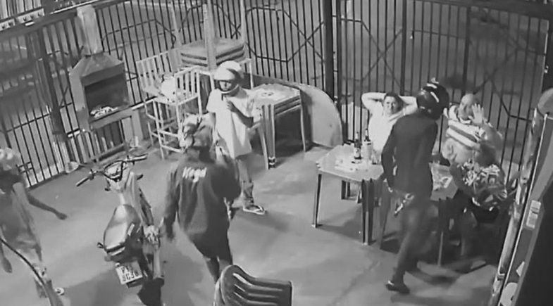 Imagens de câmera de segurança mostram três pessoas em uma mesa, sendo um homem e duas mulheres, quando o primeiro suspeito entra já de capacete e apontando uma arma de fogo para o trio. Logo em seguida, outro homem também de capacete entra no local e observa o movimento, enquanto o primeiro aborda as vítimas.