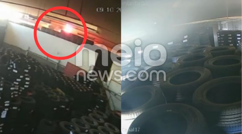 Em um dos vídeos, é possível ver que, por volta das 8h44, uma fumaça começa a sair de pneus localizados no piso superior. Em questão de segundos, as chamas aparecem e se espalham rapidamente. A gravação encerra às 8h47. O outro registro mostra um ângulo diferente do local, com uma fumaça intensa.
