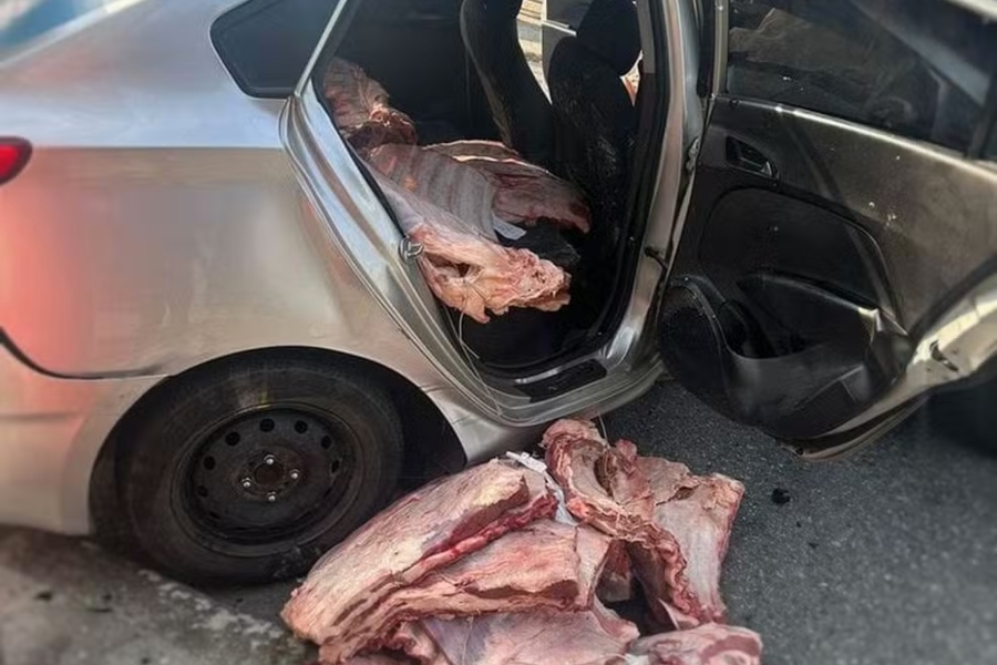 Acidente e prisão: Assaltantes em fuga batem carro após roubo de carga de carne no RJ