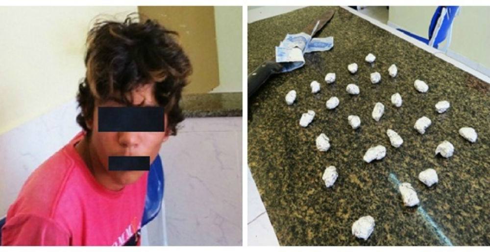Questionado sobre a origem da droga, o adolescente afirmou que comprou no Bairro São Vicente de Paula, em um trecho conhecido como “Teteus”. A guarnição seguiu para a casa do apreendido no bairro no Bairro Floriópolis, próximo ao trecho conhecido como “Morro do Carcará”. Na casa foram encontrados ainda mais treze pequenos tabletes de maconha, R$ 8,00 e um facão.