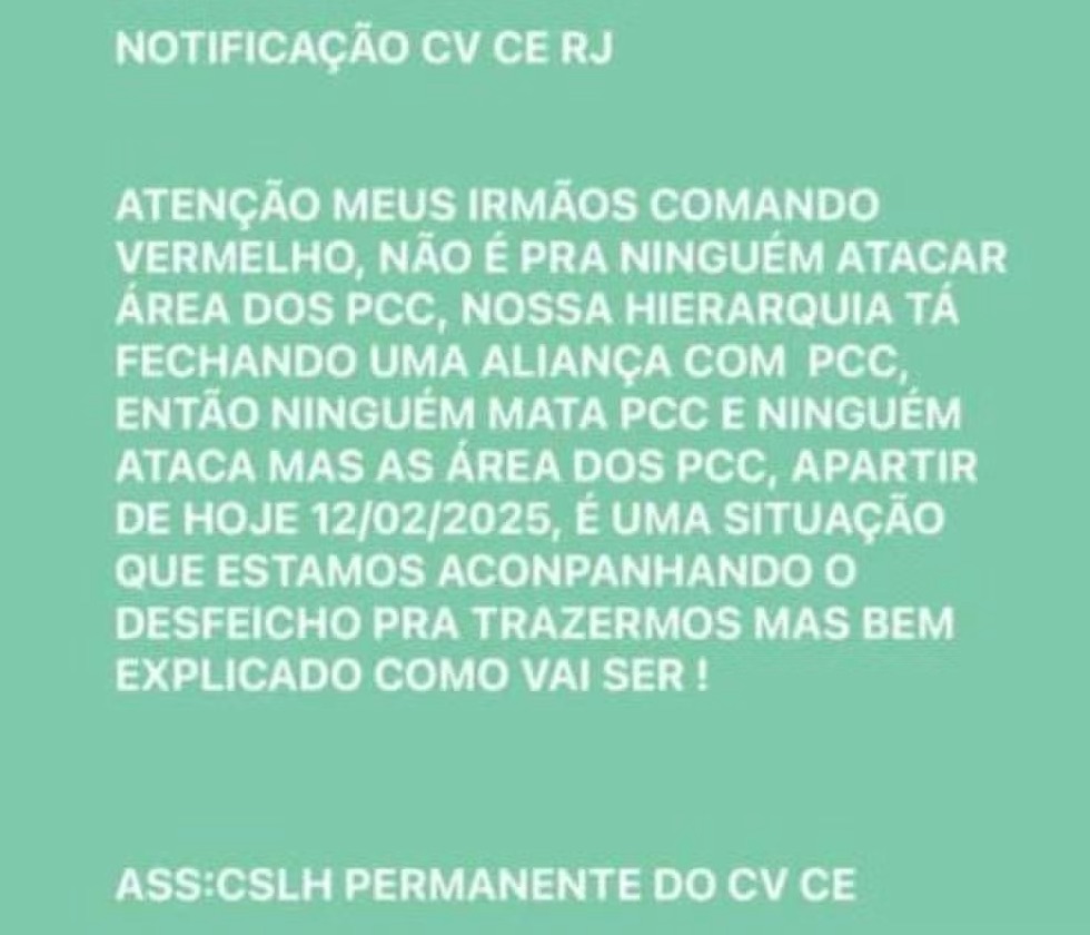Graças ao esforço de muitos e a uma longa negociação, chegamos ao tão esperado fim. Frisamos que o fator que mais pesou, sem dúvida alguma, foi o bem maior que se chama vida (…). A partir de hoje, 25/02/2025, data essa histórica, o CV e o PCC estão colocando fim a esta guerra e refazendo uma nova aliança de PAZ, JUSTIÇA, LIBERDADE E FRATERNIDADE.