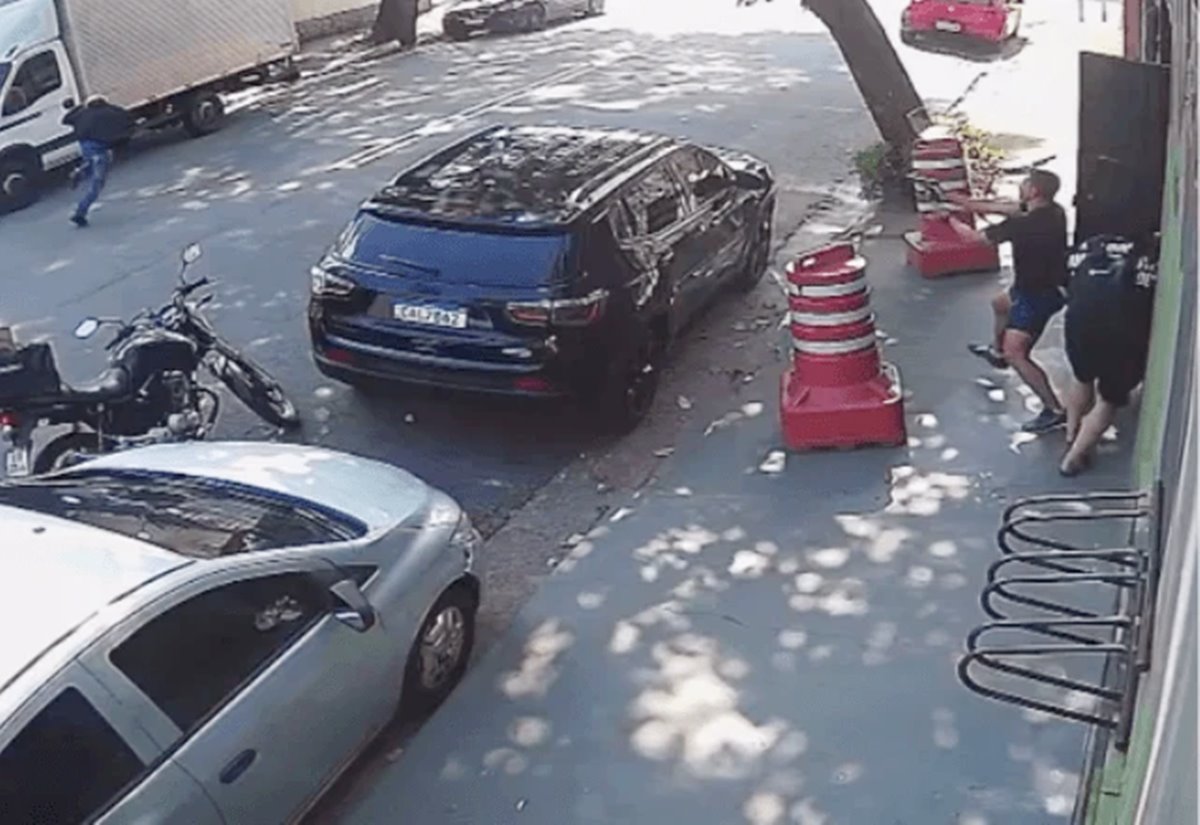 Quando se dirigia de volta à motocicleta, um homem abre o portão da academia e dispara várias vezes contra o assaltante, que corre por alguns metros, mas é atingido.