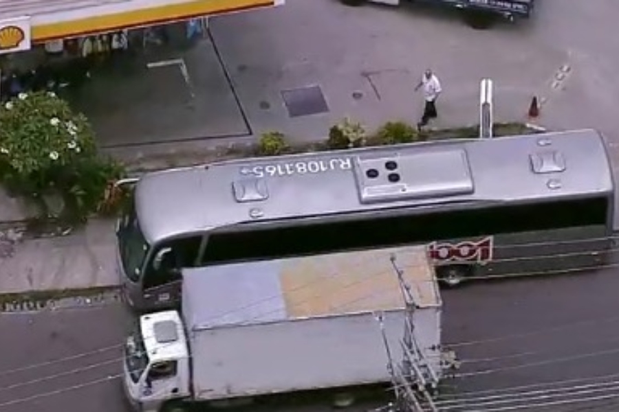 A Polícia Militar informou que a dupla roubou passageiros de um ônibus da Viação 1001 (linha Galeão X Charitas) na Avenida Brasil, na altura do Viaduto Brigadeiro Trompowsky.