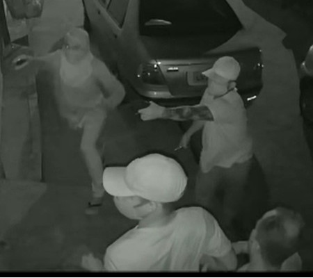 De acordo com a gravação, é possível ver o momento em que dois homens estão conversando na frente de uma residência com o portão aberto quando três criminosos param em um veículo e descem armados e com blusas na cabeça rendendo as vítimas.
