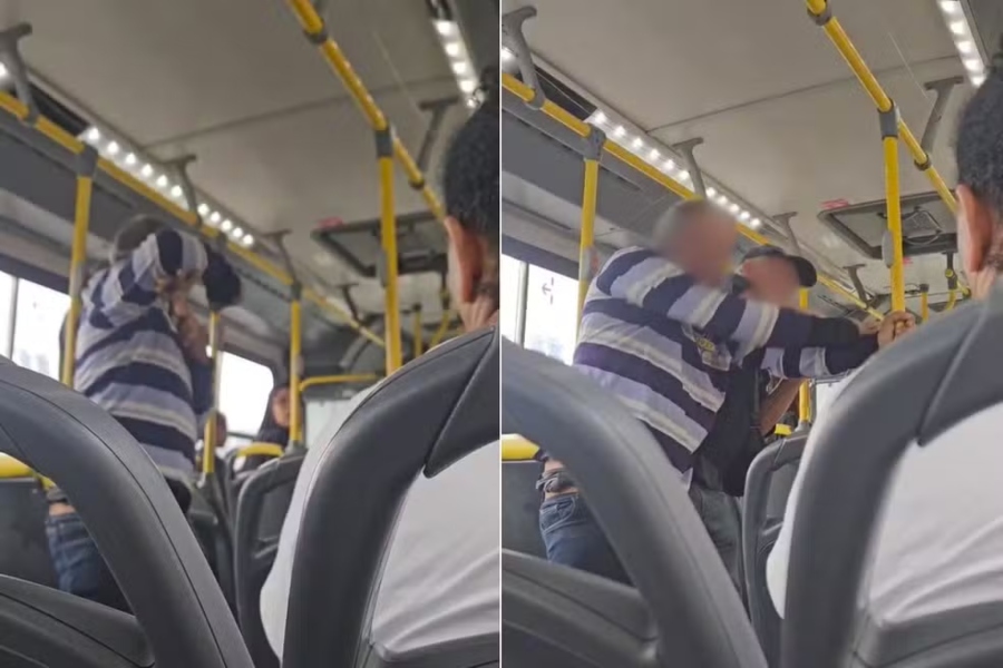 Dois homens foram flagrados brigando dentro de um ônibus municipal de Santos, no litoral de São Paulo. Um vídeo divulgado nesta quarta-feira (30), mostra o momento em que um idoso, que estava sendo agredido com socos, aplicou um 'mata-leão' no outro passageiro.