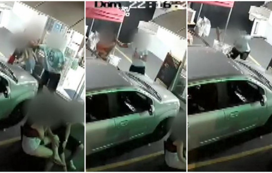 O funcionário do posto se aproxima e fala com homem, só então ele para de agredir a esposa. Com um chute, ele ainda quebra o farol do carro.