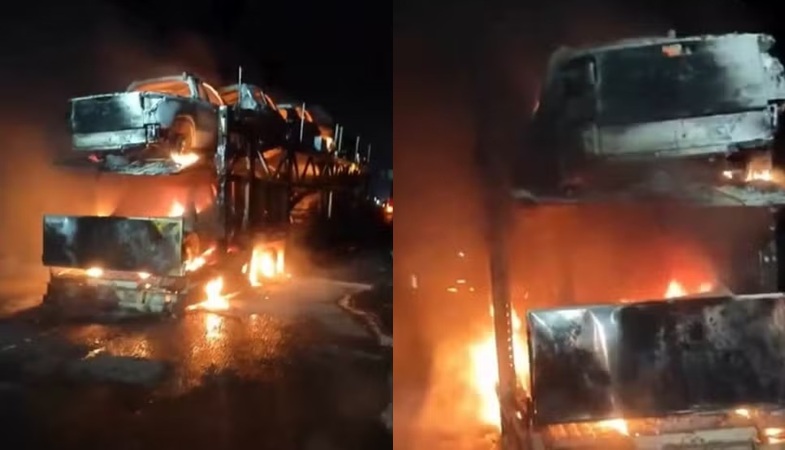 Um caminhão-cegonha que transportava 11 carros pegou fogo na madrugada desta segunda-feira (4) na BR-101, em Terra de Areia, no Litoral Norte do RS. Ninguém ficou ferido.