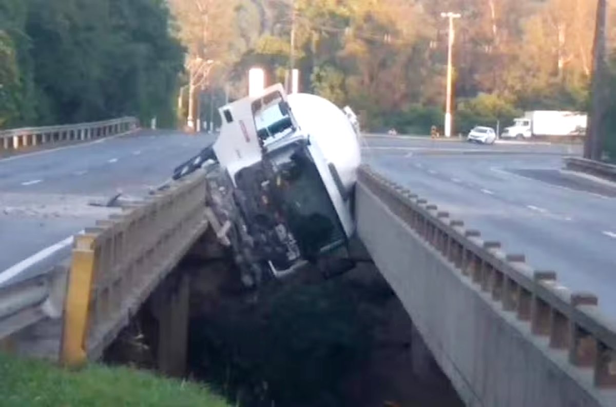 Um caminhão-tanque carregado com gás tombou e ficou suspenso entre duas pontes no km 11 da RS-122, em São Sebastião do Caí, nesta terça-feira (11). A Fundação Estadual de Proteção Ambiental (Fepam) alertou para o risco de explosão. O trânsito está interrompido nos dois sentidos da via.