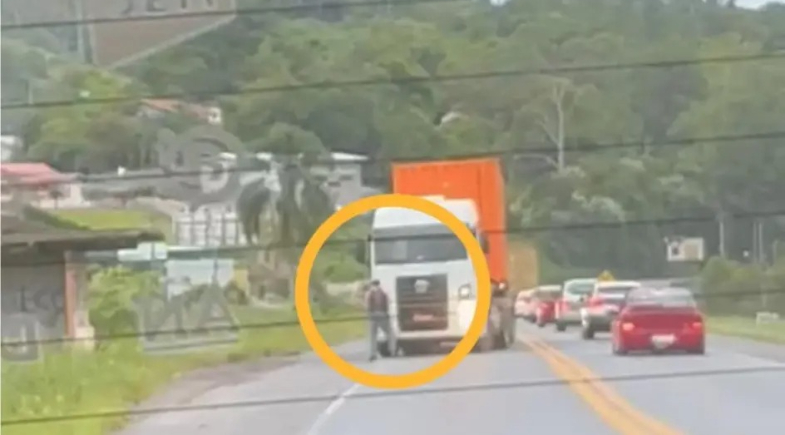 Um caminhoneiro foi flagrado em uma cena simplesmente inacreditável. O homem parou o veículo no meio da pista na BR-470, em Rio do Sul, e desceu para urinar, na tarde desta quarta-feira (11).