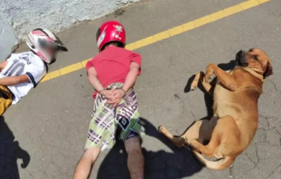 Uma equipe da PM fazia patrulhamento por uma avenida da cidade quando avistou dois homens que tentaram fugir, mas foram detidos pelos agentes. No momento em que os suspeitos receberam a ordem para deitar no chão, o animal passava pelo local e decidiu 'imitá-los'.