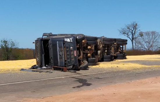 Uma carreta tombou no final da manhã desta sexta-feira (10), na BR 135, na cidade de Redenção do Gurgueia, no Sul do Piauí. O veículo transportava uma carga de milho, que se espalhou pela pista.