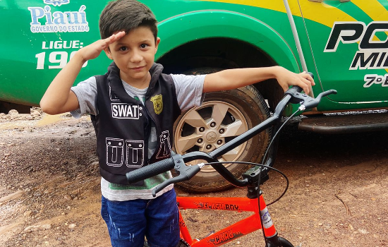 Um menino, identificado como Heitor, foi presenteado neste Natal com uma bicicleta pelos policiais do 7º Batalhão da Polícia Militar no município de Corrente, região Sul do Piauí.