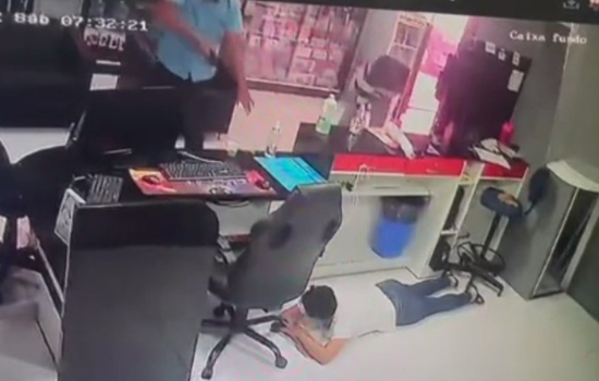 Imagens de câmera de segurança registraram o crime e mostram o momento em que a dupla entra armada no estabelecimento comercial e obrigam clientes e funcionários a deitarem no chão. Uma mulher que chegava ao local também foi rendida.