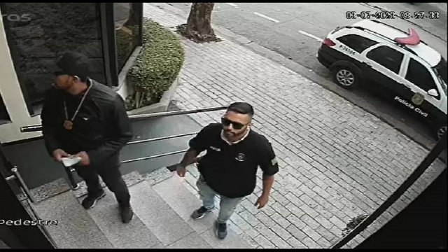 No registro, é possível observar que um deles estava usando um distintivo da Polícia Civil e o outro, uma camiseta que possuía a identificação do órgão policial. É visto também o homem segurando um falso mandado enquanto conversa com o porteiro do prédio, tentando convencê-lo a deixar a dupla entrar.