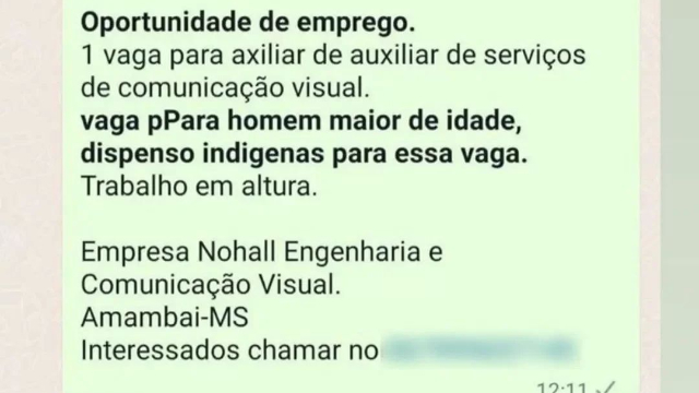 O texto em questão, que foi divulgado em grupos no aplicativo de mensagens WhatsApp dos moradores da cidade, dizia “dispensar indígenas para essa vaga”. A cidade de Amambai é, coincidentemente, um dos municípios com maior número de indígenas na população do Mato Grosso do Sul. A vaga em questão também continha informações dizendo que o emprego era destinado "para homens".