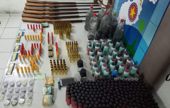 Objetos apreendidos: - 100 Munições Cal. 22; - 22 Munições Cal. 38; - 05 Munições Cal. 44; - 18 Munições Cal. 32; - 06 Espingardas de fabricação caseira; - 01 Espingarda Cal. 32; - 06 Cartuchos Cal. 32; - 25 Cartuchos Cal. 20; - 59 Cartuchos Cal. 32; - 40 Cartuchos Cal. 28; - 26 Cartuchos Cal. 36; - 39 Cartuchos Cal. 40; - 31 Cartuchos CBC Cal. 28; - 30 Cartuchos CBC Cal. 20; - 12 Cartuchos CBC Cal. 36; - 05 Cartuchos CBC Cal. 12; - 19 Caixas de espoletas; - 32 Frascos de pólvora azul; - 06 Frascos de pólvora verde; - 203 Frascos de pólvora vermelha; - 02 Frascos de pólvora preta; - 22 pavis; - 200 espoletas p/ cartucho plástico; - 42 Kg de chumbo; - R$ 1.814,00 (Mil oitocentos e quatorze reais).