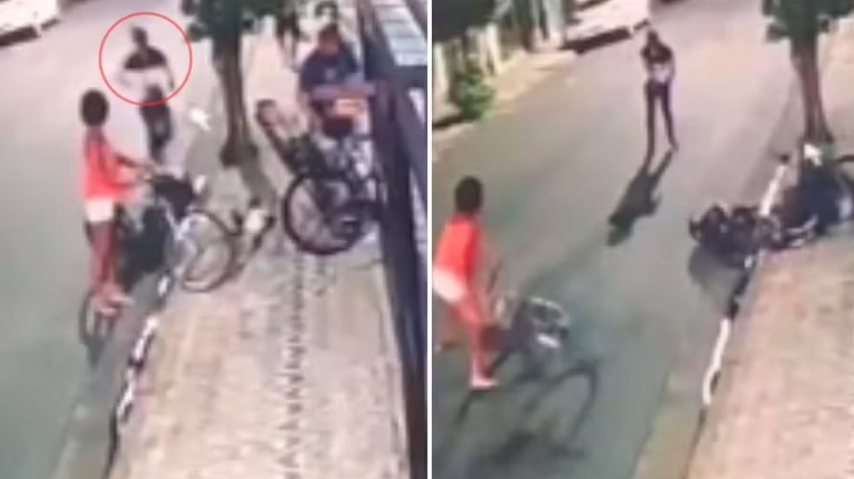 Nas imagens, é possível observar a vítima chegando de bicicleta ao prédio com o filho e a esposa, que aparece de vermelho em outra bicicleta. Em seguida, um homem aparece por trás de Dejon Kovac e efetua disparos antes de fugir.