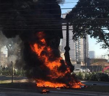 Vídeos publicados em redes sociais mostram vários pneus interditando a avenida Santo Amaro enquanto a estátua estava em chamas.