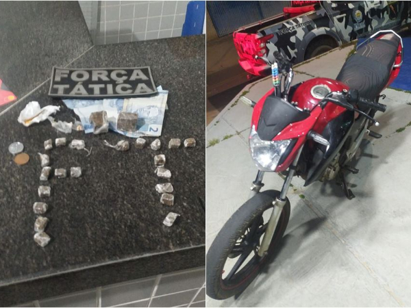Com o casal a Força Tática encontrou 25 porções de maconha, 06 porções de crack e uma quantia em dinheiro, proveniente da venda de drogas. Eles andavam em uma motocicleta, modelo CG 160, de cor vermelha, sem placa, que também foi apreendida.