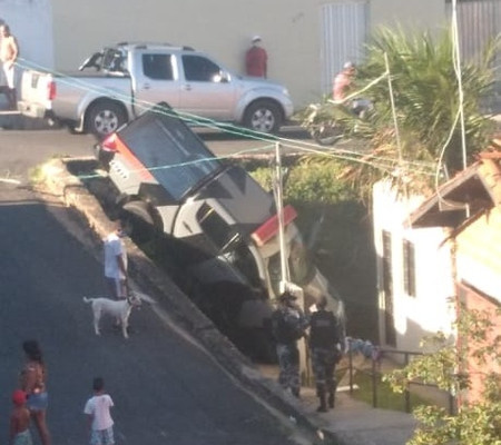 O freio da viatura teria falhado e o veículo acabou descendo um barranco. Por pouco uma residência não foi atingida. Os dois policias que estavam no carro não ficaram feridos.