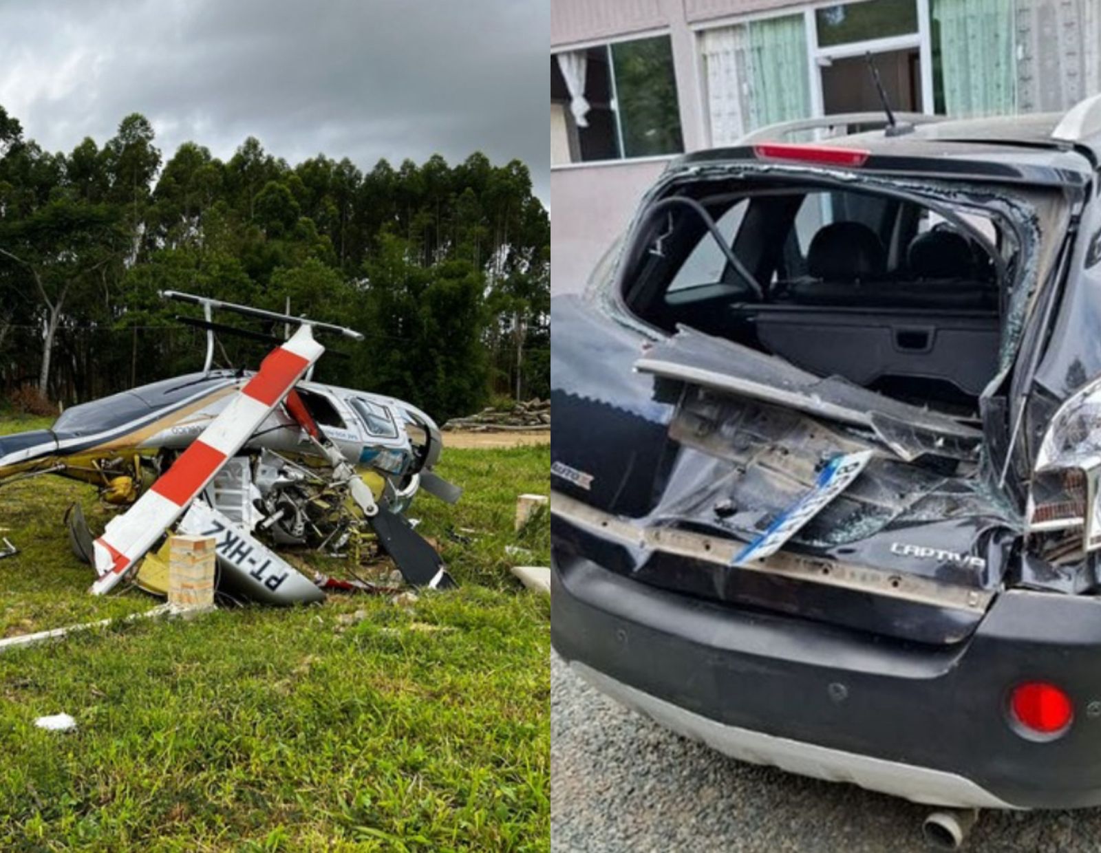 Parte da hélice do helicóptero que caiu com cinco pessoas na tarde de sábado (4) próximo à rodovia de acesso ao Parque Beto Carrero World, em Penha (SC), se desprendeu e atingiu um carro a cerca de 500 metros de distância da queda. O veículo, modelo Captiva, foi atingido em cheio na traseira e ficou bastante danificado.