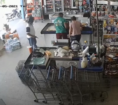Usando capacete, o suspeito entrou no supermercado, localizado no Centro da cidade, e ao puxar a arma, anunciou o assalto a uma funcionária que estava no caixa.